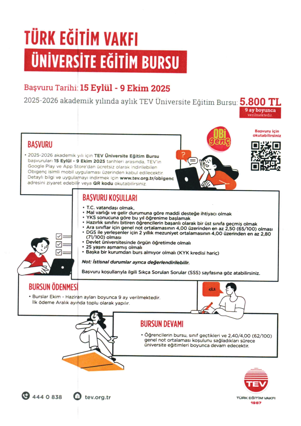 2025/2026 Öğretim Yılı Türk Eğitim Vakfı burs başvuruları 15 Eylül 2025 - 09 Ekim 2025 tarihleri arasında alınacak olup burs başvuruları TEV'in dijital platformu olan "obigenç" üzerinden gerçekleştirilecektir.
