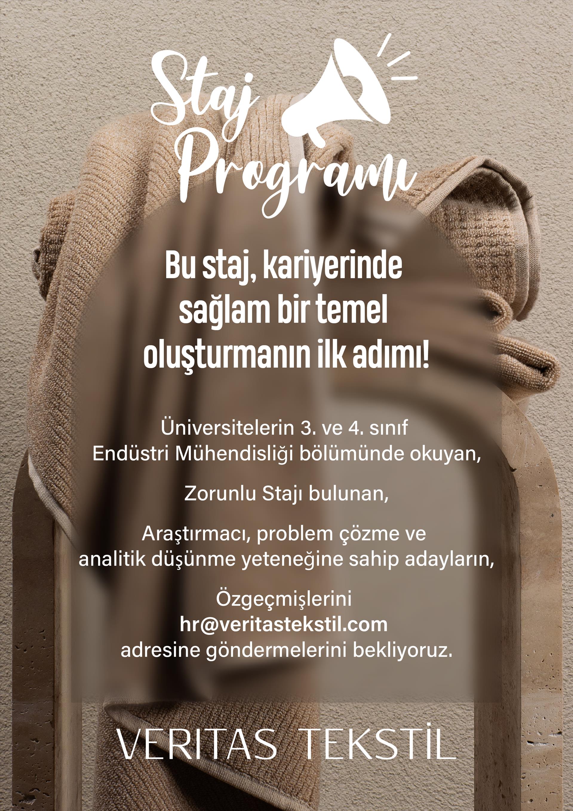 8.12.2025Zorunlu stajı bulunan 3. veya 4. sınıf öğrencilerimiz, Veritas Tekstil staj programına başvurmak için özgeçmişlerini hr@veritastekstil.com adresine gönderebilirler.